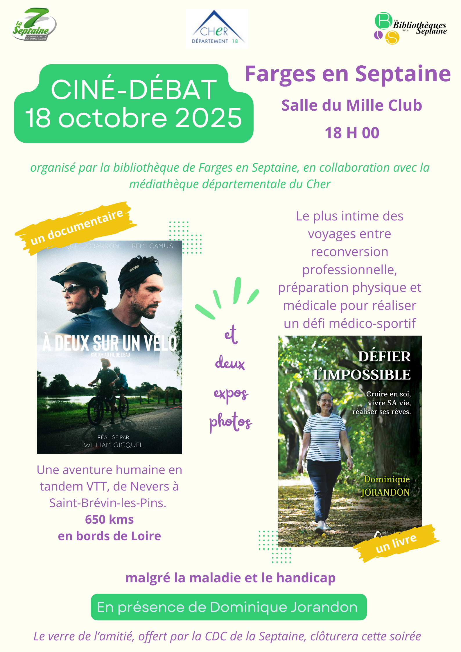 – Projection de notre film À deux sur un vélo, suivie d’un moment d’échanges sur le défi, la préparation, la maladie, le handicap, etc,